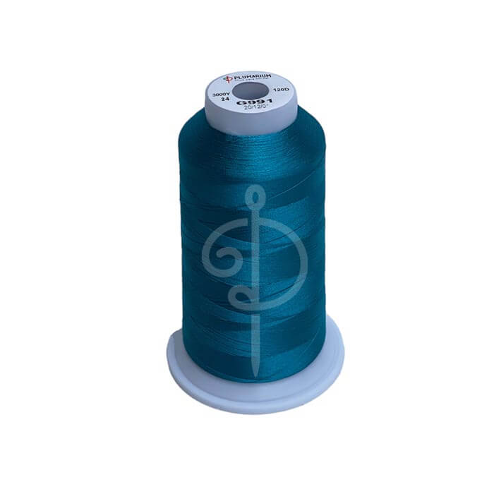 Hilo de Bordar color Verde Agumarina Profundo 100% poliester, Calibre 120, 3.000 yardas. El Hilo de poliester es ideal para la confeccion de bordados, principalmente por la estabilidad del color y su resistencia al cloro.